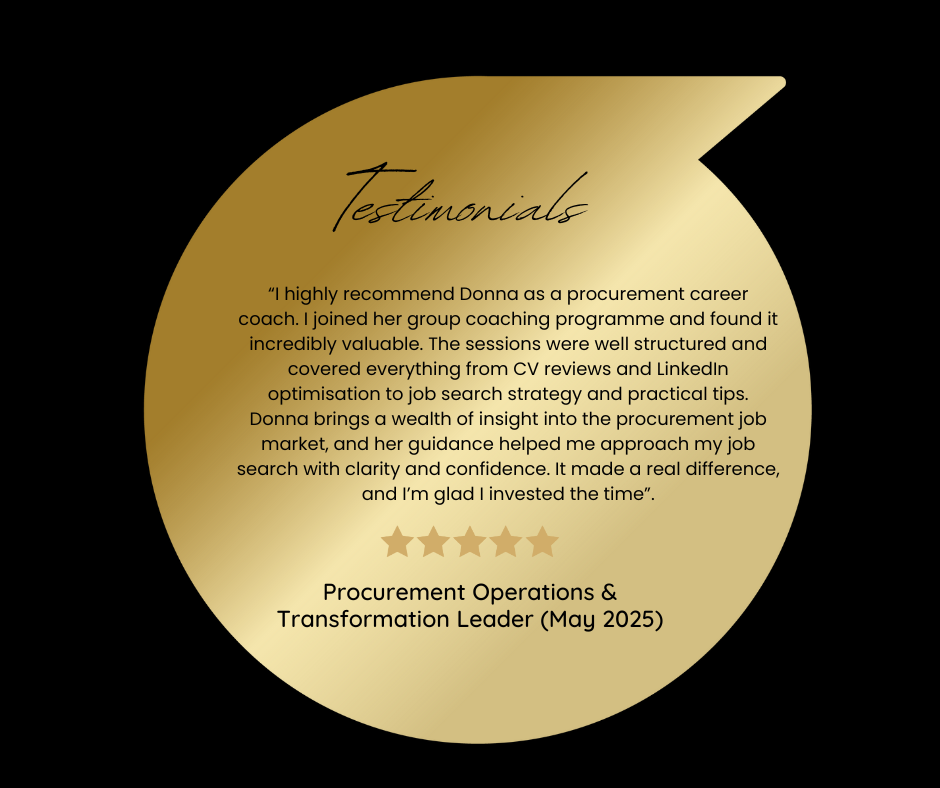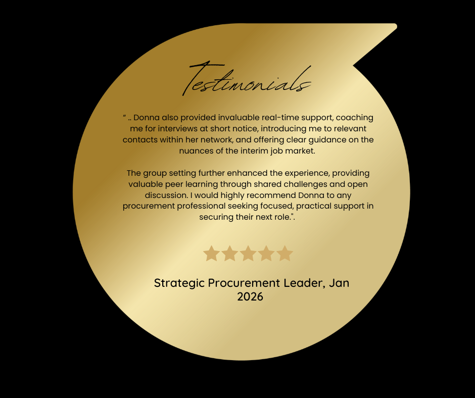 The group setting further enhanced the experience, providing valuable peer learning through shared challenges and open discussion. I would highly recommend Donna to any procurement professional seeking focused, practical support in securing their next role.".